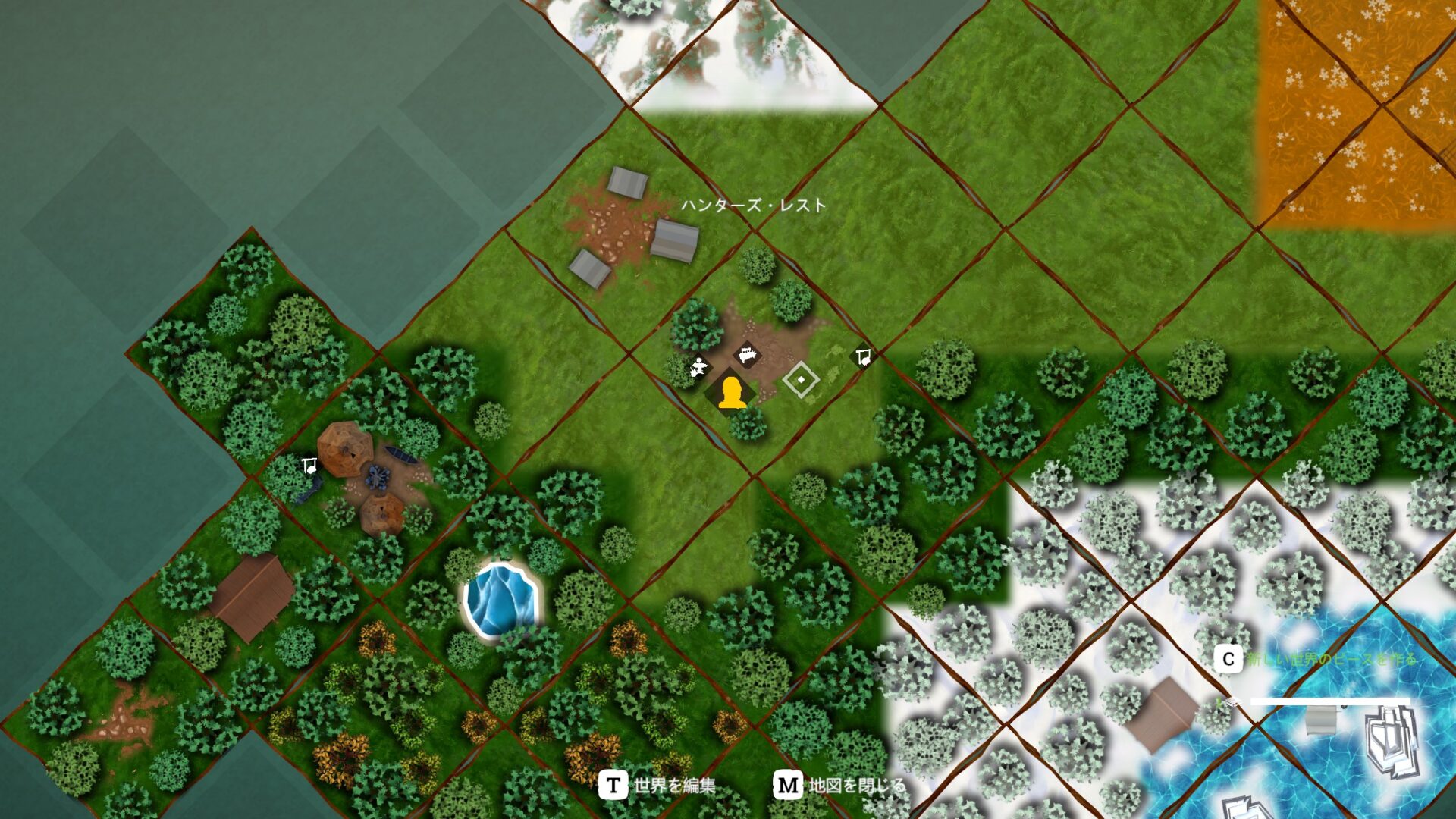 生き残る準備ができたら周囲の木を調べ、伐採し、ベリーを収穫、岩を砕き素材を得ていきます。そういう作業をすることでマップピースを配置できるポイントがたまっていきます。最大3つまでですが、最大までたまったからといって別に配置する必要はありません。というのもクエスト対象ピース(ユニークピース)も自分で配置するからです。つまり、何も考えずに配置してしまうと対象の土地までは遠くなってしまうからです。移動は序盤は徒歩(もしくはスタミナを消費して走ることも可能)となるため、遠いと移動がつらくなります(途中、馬を使ったファストトラベルが利用可能になります)。