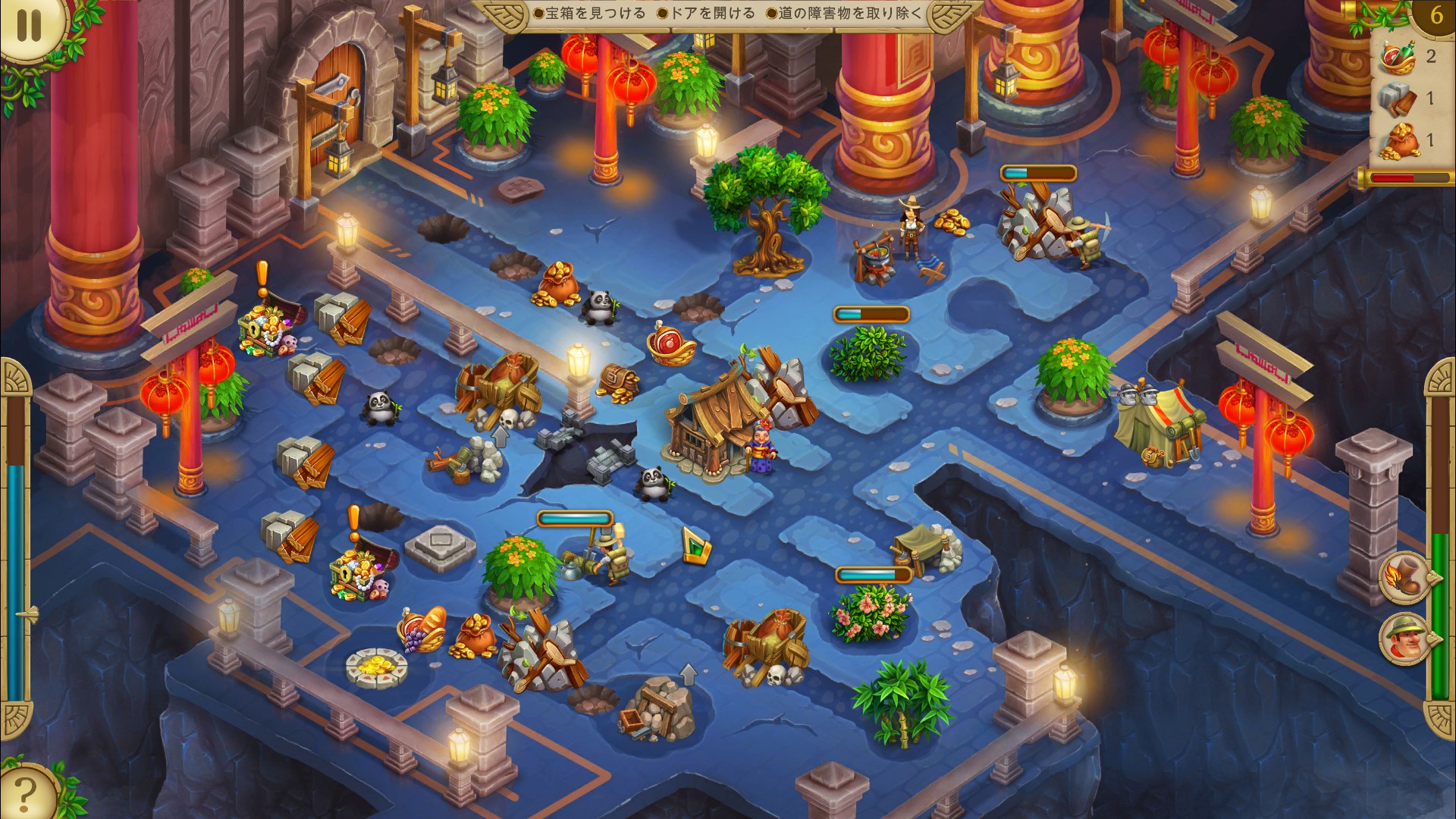 作業をするには食料、資材、お金のどれかが必要となっており、それを収集しつつ道を切り開いていきます。何も考えずにプレイしていると変な待ち時間が出てしまいますので注意が必要。先に進めば作業員が増えますのでうまいこと動かしながらアリシアを動けるようにしたりします(やらせたい作業を先行して指定することができます。先のオブジェクトなどをクリックしてチェックマークがつけばOKです。試してみましょう)。