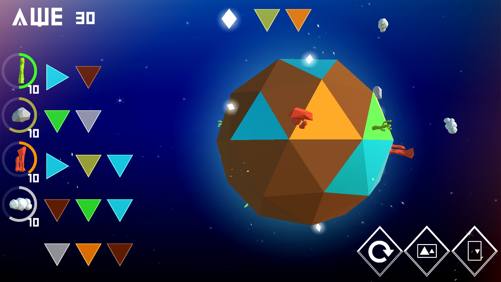 そして左の三角形群はその色の順番で惑星をクリックすれば、配置できるオブジェクトが解放されるようになっています。上は既に一番下以外は解放していますが、解放するまでは非表示です。このオブジェクトをクリックして惑星上で再クリックすると配置することができます。配置したら色が変更され、他のオブジェクトを解放するための色が増えます。なお先の惑星に進むと左の色は表示されていませんので、クリックして自分で確認していくようになります。