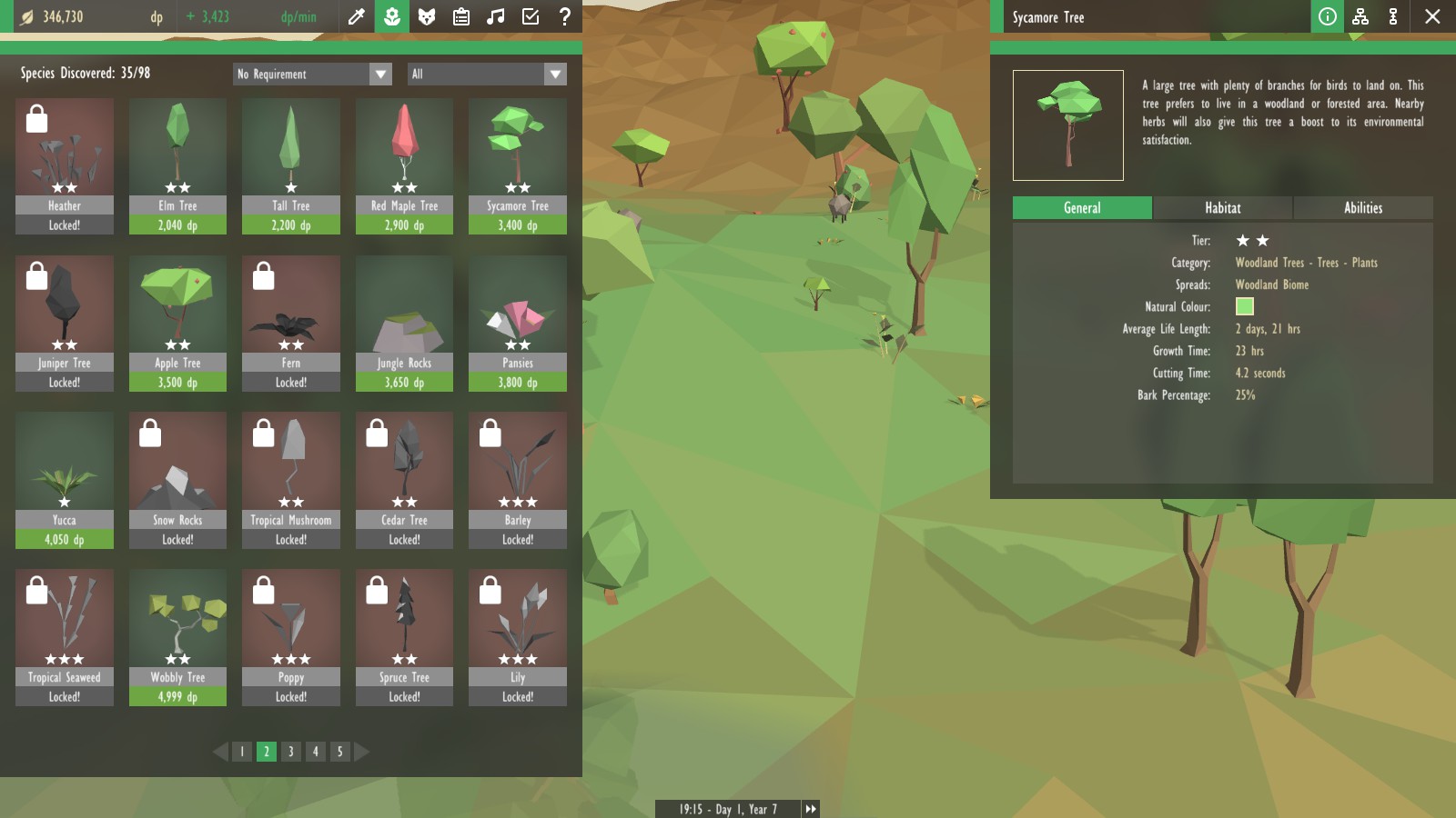 2番目のタスクが終了するとOak Tree(オークの木)、650DP、そして次のタスクが解除されます。3番目はOak Treeを50%まで育て、70%以上のenvironmental satisfaction(環境満足度)を目指します。最初はタスクをやりつつDPを得ていきます。この時点ではDPの取得はタスクだけとなりますので無駄な播種はしないようにしましょう(基本的に繁殖しますので時間さえかければ増えて行きます)。