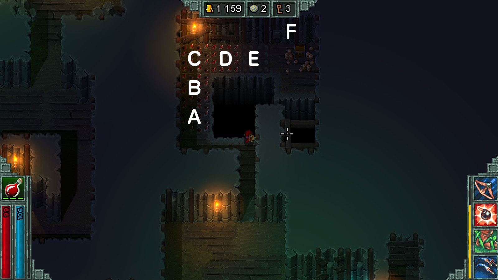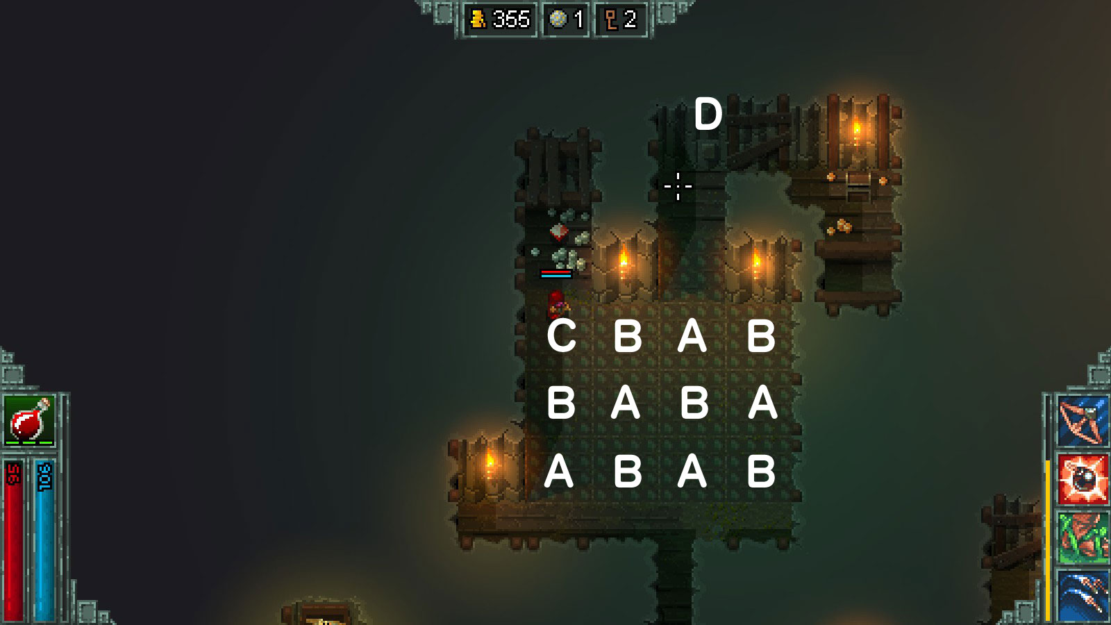 結構悩んだ棘トラップ。D地点にある圧力版を押すことでABCの棘がいったん引っ込みます。つまり踏む順番が大切なわけですが、この順番はいつもランダムになっているようです。ですので適当に踏んでみて「ABC」の順番で棘がでるパターンを探します。