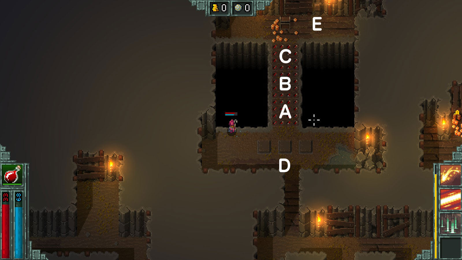 A(C)とBで交互に棘が現れるトラップです。Cの上にある場所は装置を止める前に行かないとダメージ必須になります。進み方としてはAを基準に進む場合、Aの棘が消えたらAの中に入ります。少し待ってBの棘が消えたら即移動します。基本この繰り返しです。