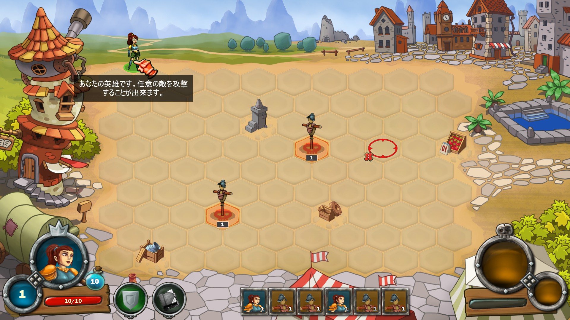 戦闘は画面下部に表示されている順番通りに進みます。王女は基本的に動くことはできず、仲間に加わったクリーチャーだけ動かし敵を倒していきます。王女は魔法で敵を攻撃でき、また画面左下の盾でガードを固めさせたり、その横の魔法書に登録された標準で持っている以外の魔法を使って補助をすることができます。
