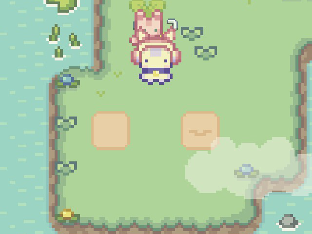 まずは島内の整地から進める必要があります(石は移動時にひっかかるので邪魔になります)。花など一部採取できないものがありまうが、これらは鍬で耕すことで取り除くことができますので気にしないでいいでしょう。木の柵も斧で破壊できます。古いものという扱いなので壊してもアイテムの入手はできませんが、邪魔になるものはどんどん破壊しましょう(自作した設備などはツルハシで使用すると回収することができます。ただし木の橋だけは一度設置すると破壊すらできません。島は地面タイルで大きくできるので装飾以外で使用する必要はないかもしれません)。