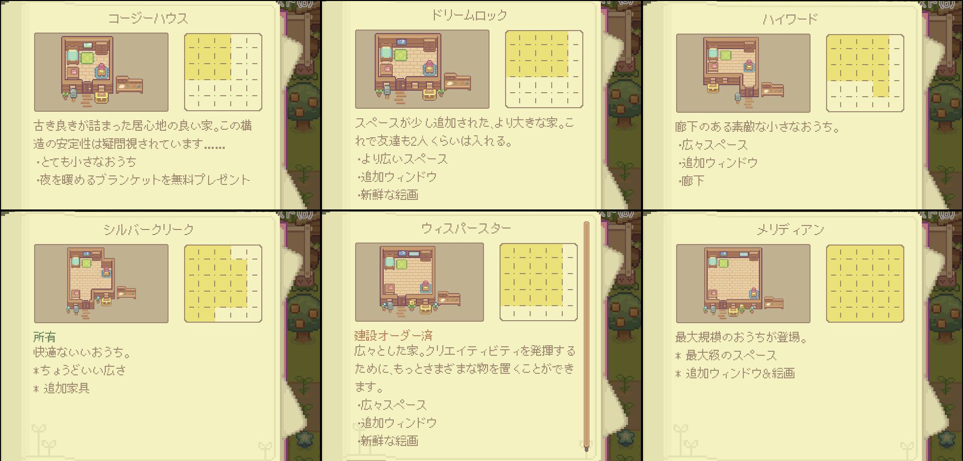 家の前にあるチェストやワークベンチは移動できません。おそらくベッドが視点として配置されるので自宅を変更する場合はよく考えて行いましょう。またチェストはアイテムを選択した時、選択肢の「店舗」で向かう先です(ペットと帽子はドレッサーに入れることが可能)。もちろん店舗と書かれていても売られるわけじゃないので安心してください(ゲーム開始直後はここでも売れるのかと勘違いしていました。保管の誤訳だとどうしたら気づきますか!)。
