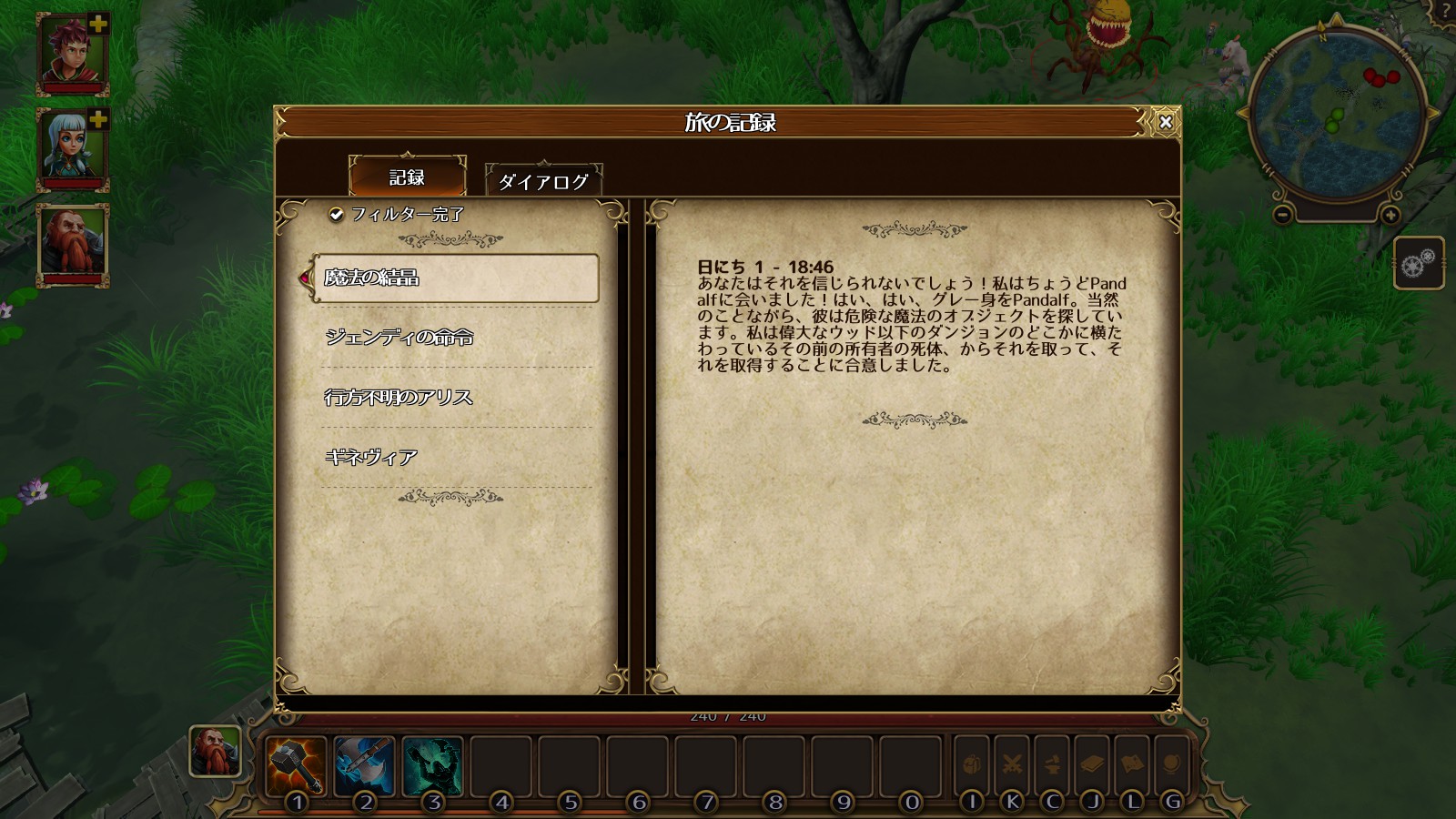 このゲームは物語を楽しんでほしいようでかなりの文章量があります。ジャーナルを開くと現在のクエスト状況と過去の全ての会話が記録されるようになっています。上SSはGoogle翻訳を使って日本語化していますが、標準で日本語がないのは非常にもったいないとは思います。